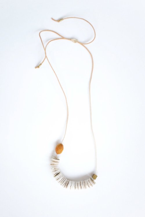 This disc necklace works the same as the other disc necklaces but uses smaller discs for a more delicate look. Color plays a part in the design and inspiration of this necklace. Chamomile seeds are used exclusively in this design.
